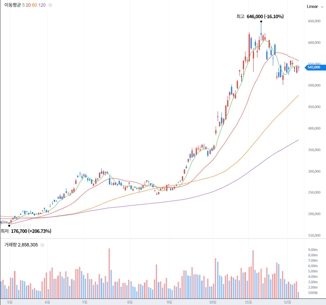 하지만 중장기 흐름은 매우 좋습니다. 60일, 120일 이동평균선이 모두 우상향하는 '완벽한 정배열' 상태입니다.